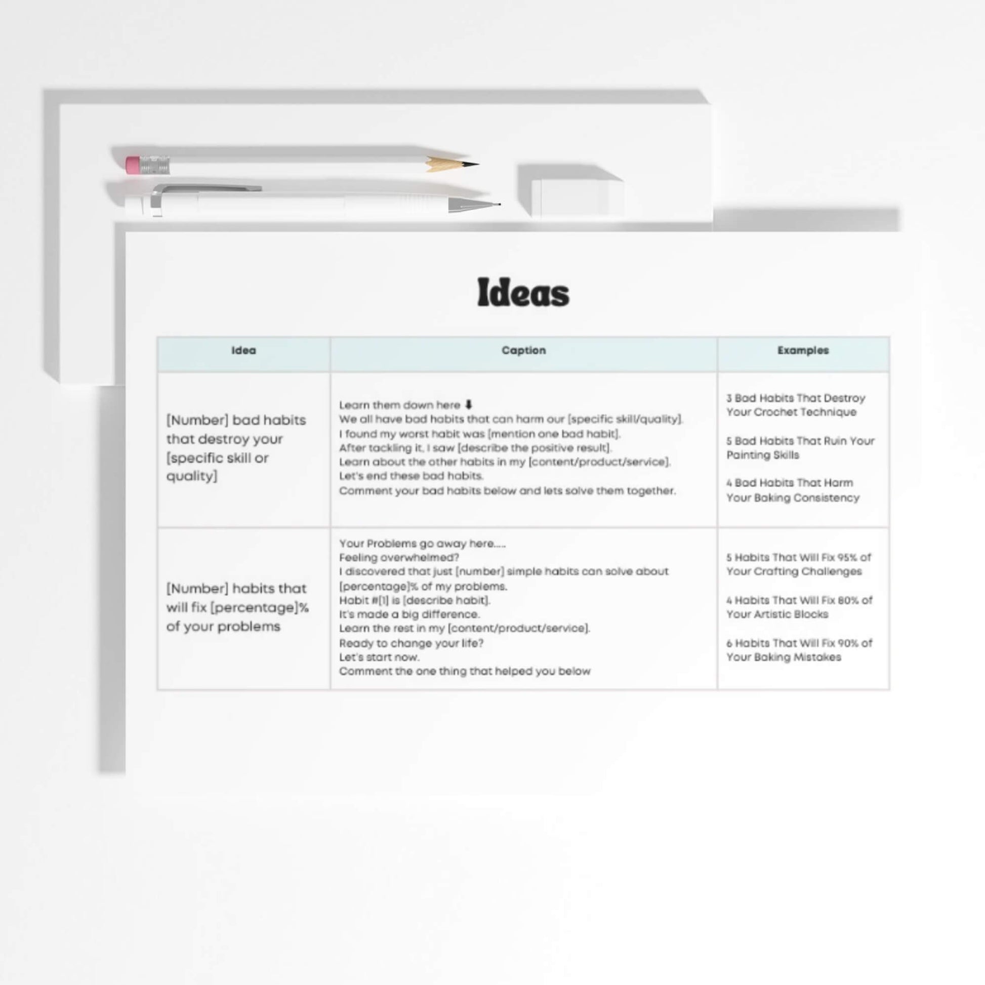 ✔︎Chaque idée est accompagnée d'un produit écrit/d'un exemple créatif& certains ont un lien vers une vidéo et une publication IG. Astuce : utilisez l'audio de la vidéo dans l'exemple.