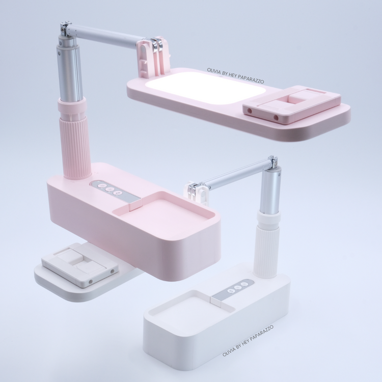 Olivia 2 overhead phone stand is stronger, brighter and allows for larger shots without the base sneaking into your videos. Share your passion with ease and grow your audience with beautifully lit videos.